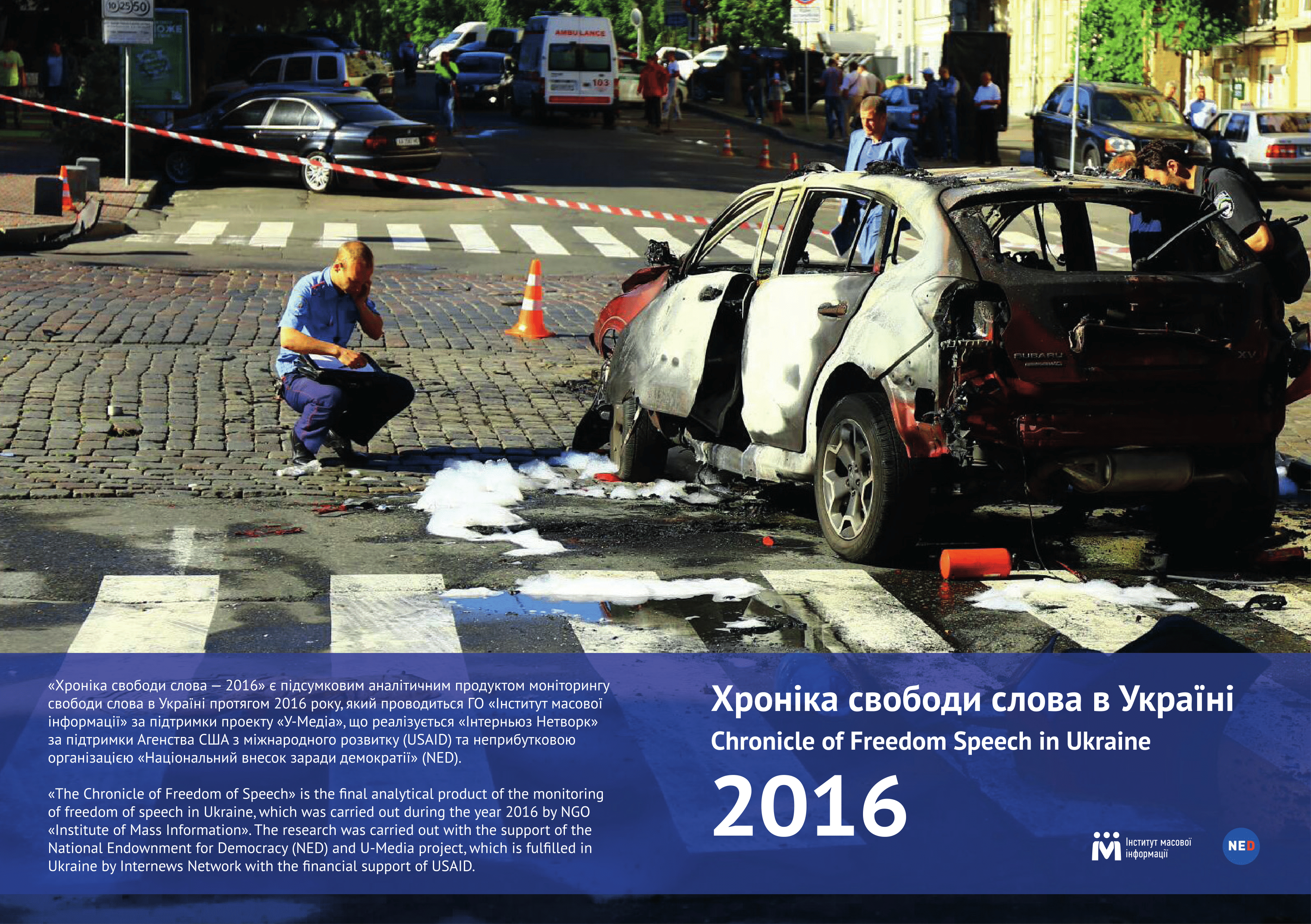 «Хроніка свободи слова 2016» є підсумковим аналітичним продуктом моніторингу свободи слова в Україні протягом 2016 року, який проводився ГО «Інститут масової інформації» за підтримки проекту «У-Медіа», що реалізується «Internews Network» за підтримки Агенства США з міжнародного розвитку (USAID) та неприбуткової організації «Національний внесок заради демократії» (NED).