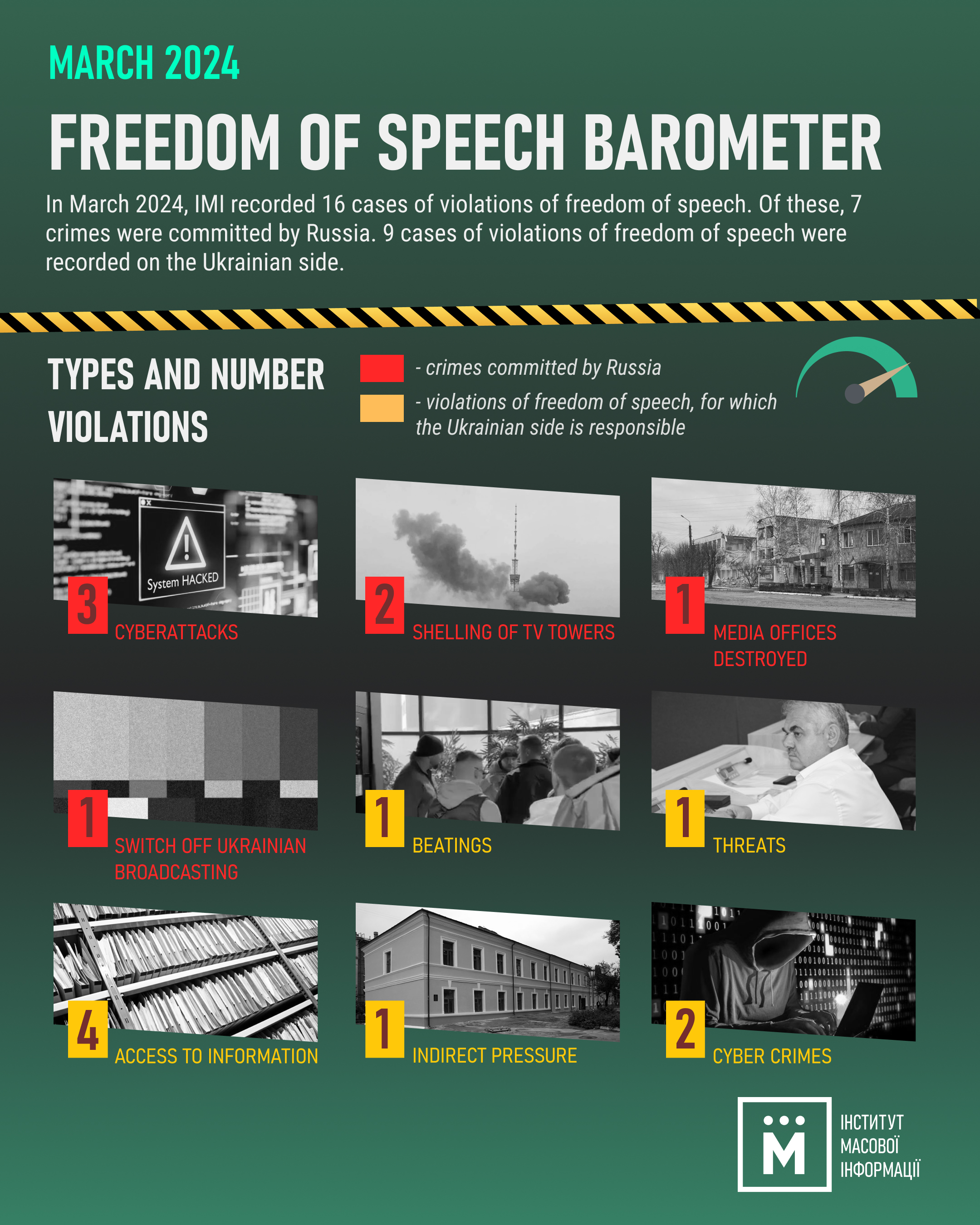 The Institute of Mass Information experts recorded 16 freedom of speech violations in Ukraine in March, according to the monthly IMI monitoring “Freedom of Speech Barometer”.