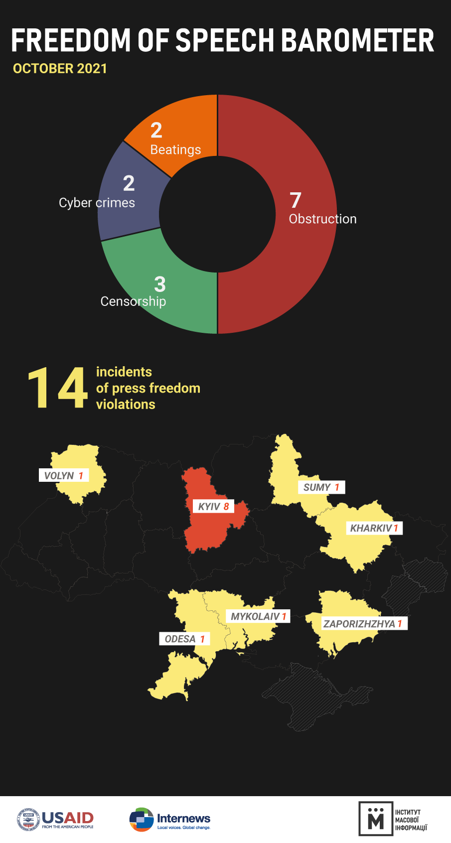 In October, IMI experts recorded 14 cases of violations of freedom of speech in Ukraine. Of these, nine cases involved physical aggression against journalists. These are the figures of the monthly monitoring of the Institute of Mass Information " Freedom of Speech Barometer" *.