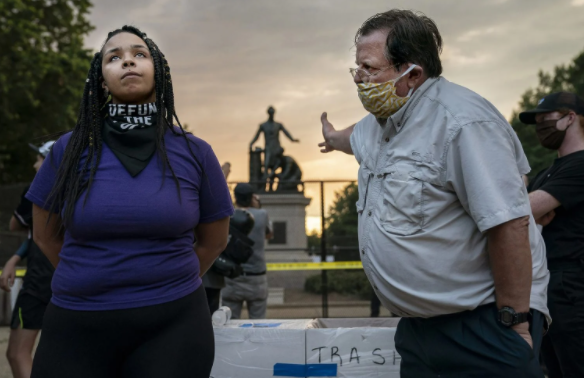 Winner in the Spot News Singles category was an image embodying the debate on race in the United States. The photo by Evelyn Hockstein for The Washington Post shows a white man and a Black woman disagreeing about the removal of the Emancipation Memorial in Washington, D.C., which depicts a freed slave kneeling at Abraham Lincoln’s feet.