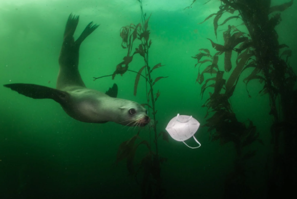 The pandemic even reached the Environment Singles category, with U.S. photographer Ralph Pace winning for his image of a curious California sea lion swimming toward a face mask drifting underwater at the Breakwater dive site in Monterey.