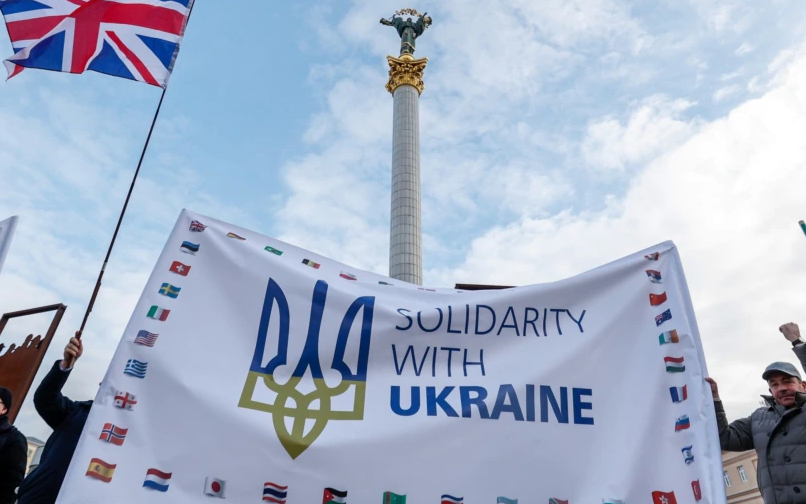 An international rally in support of Ukraine, which is under threat of a full-scale Russian invasion, took place in the center of Kyiv on February 6, as Radio Svoboda reported.