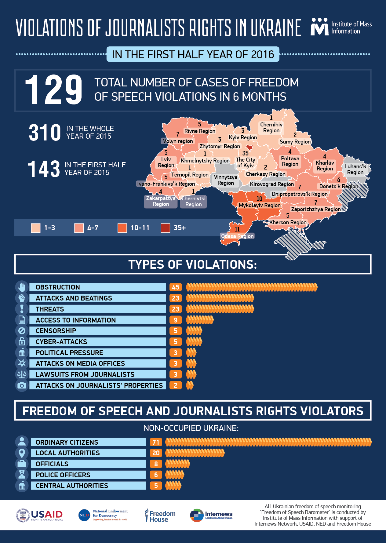 Freedom of speech situation in Ukraine has slighlty improved in the first half of 2016 - IMI experts registered 129 cases of freedom of speech violations in total, compared to 143 cases for the same period in 2015 (including the occupied territories and the Crimea - 154 cases compared to 175 violations in the first half of 2015).
