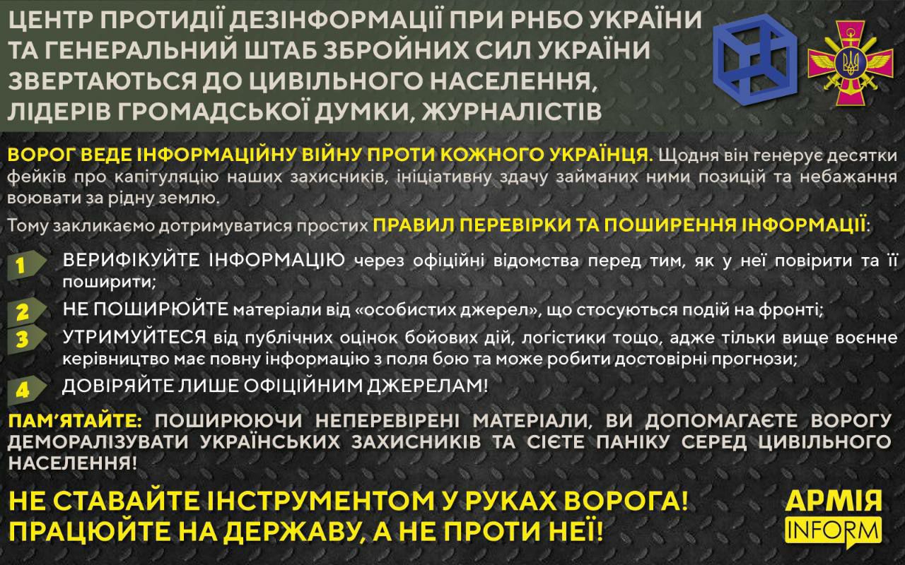 The National Security and Defense Council's Center for Countering Disinformation and the General Staff of the Armed Forces of Ukraine call for compliance with the rules of information verification and publication.