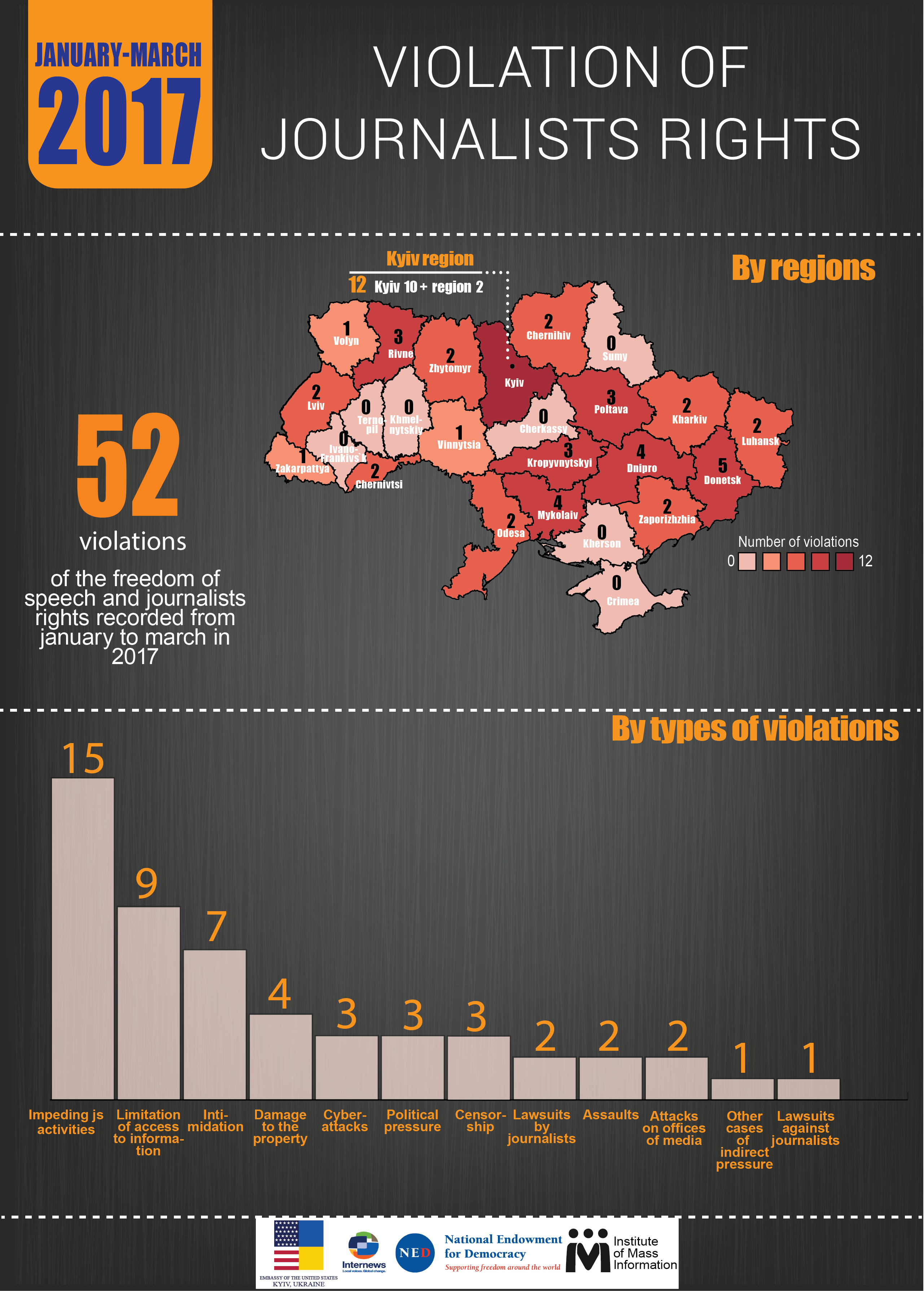 IMI recorded 52 cases of violations of the freedom of press that took place in 18 regions of the country, during the first quarter of 2017 in Ukraine. The main violations during last three months were - obstruction to lawful professional activities of journalists - 15 cases, 9 cases of restricting access to public information for journalists and 7 cases of threats.