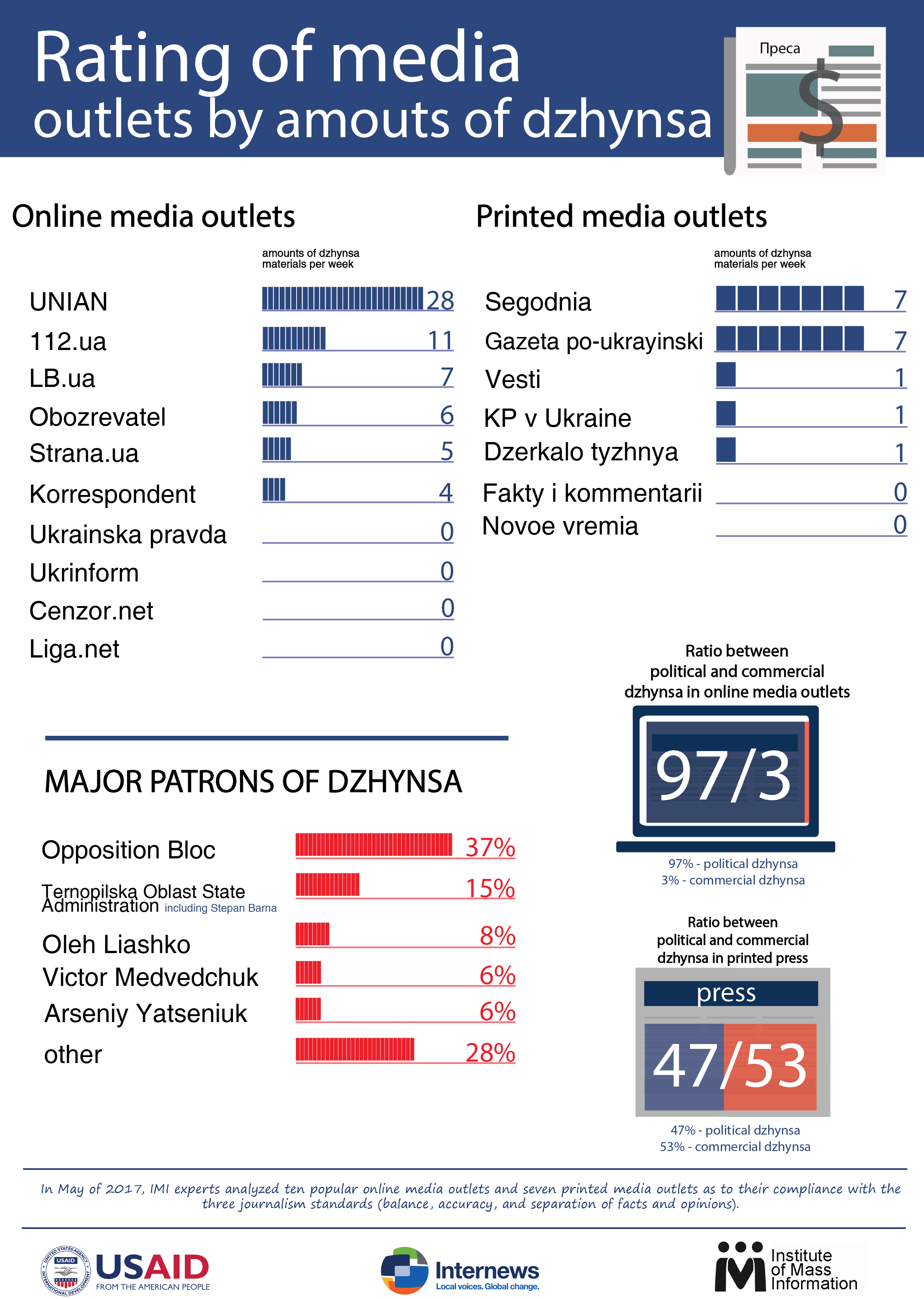 These are the results of the research conducted by IMI concerning the covertly commissioned materials in 10 online media outlets («Ukrainska Pravda», «Liga», UNIAN, Ukrinform, «Korrespondent», Channel 112, LB.ua, «Strana.ua», «Obozrevatel» and «Censor.net») and six printed editions («Fakty I Kommentarii», «Segodnia», «Vesti», «Dzerkalo Tyzhnia», «KP v Ukraine», «Hazeta Po-Ukrayinski», «Novoe Vremia»), which is conducted with the support from Internews Network.