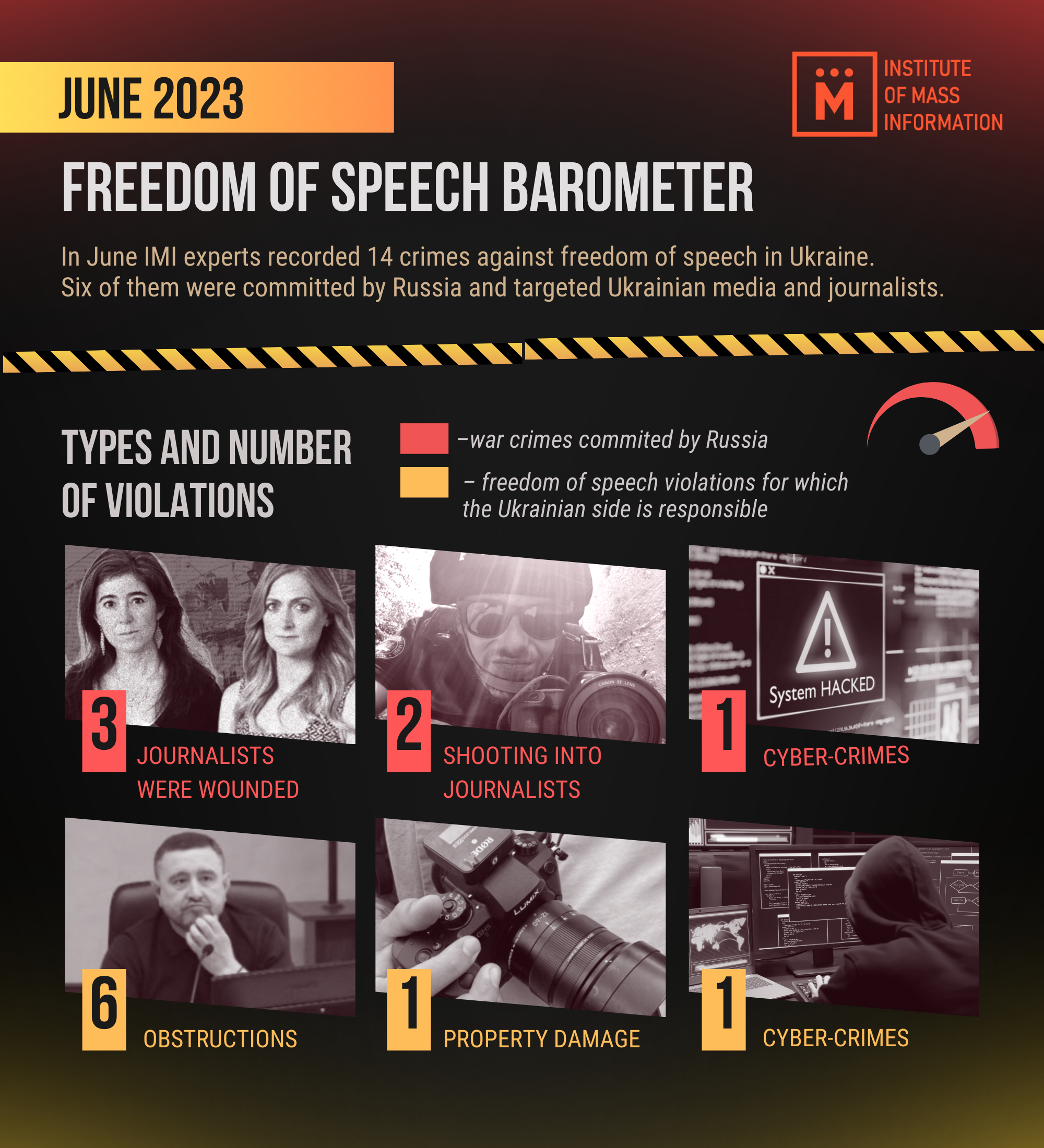 In June IMI experts recorded 14 crimes against freedom of speech in Ukraine. Six of them were committed by Russia and targeted Ukrainian media and journalists.