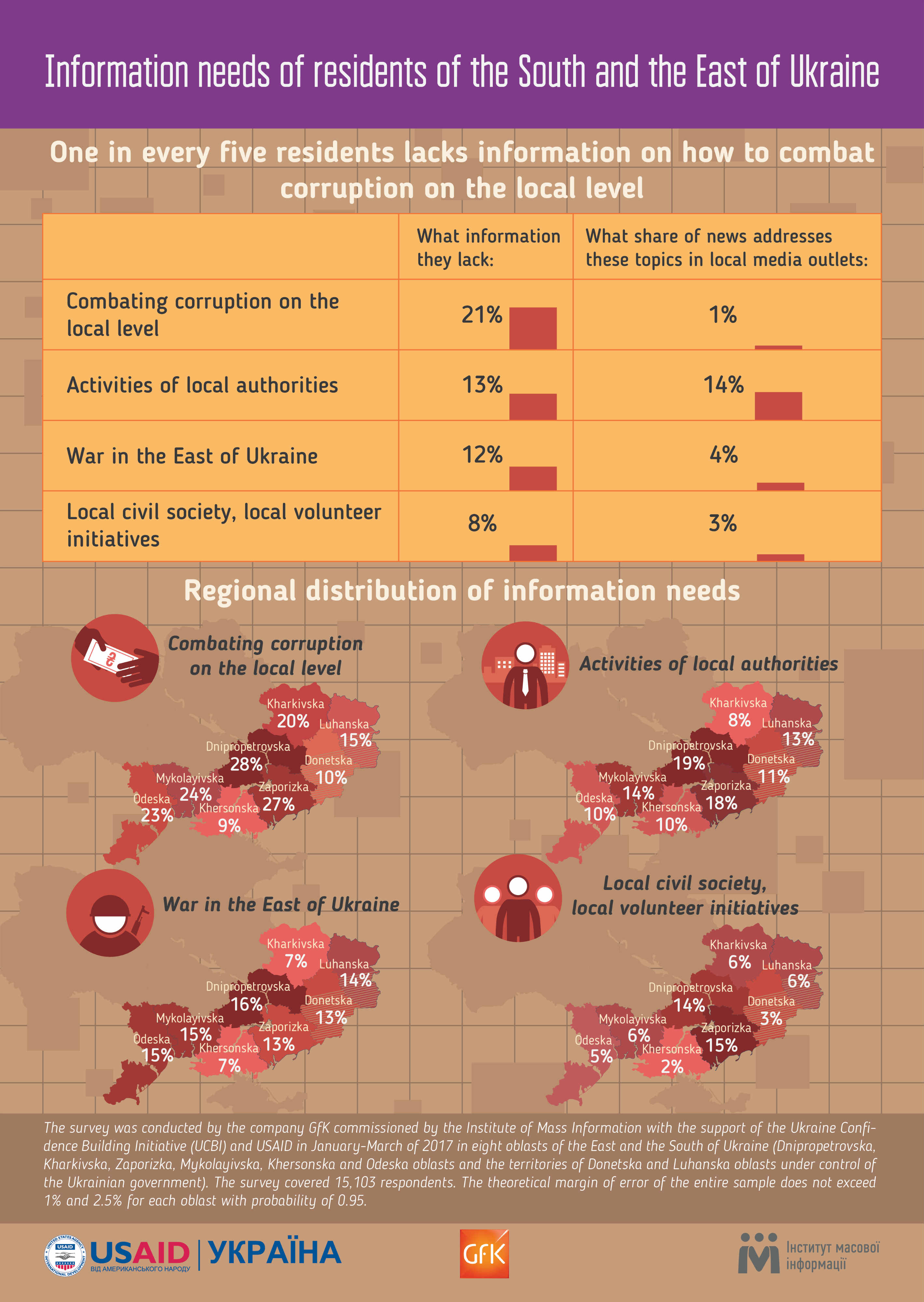 One in every five surveyed residents of the South and the East of Ukraine (21%) felt lack of information about combating corruption on the local level. At the same time, local media outlets address this topic only in about 1% of the news.