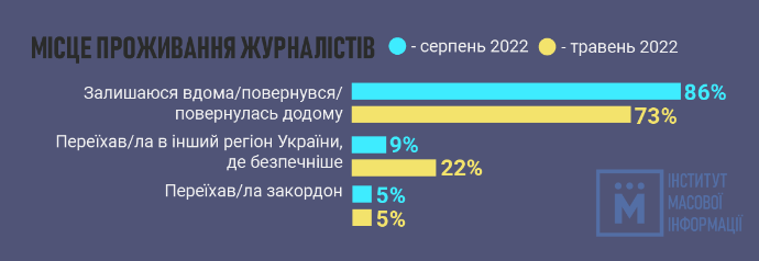 Ukrainian journalists are returning home from other regions of Ukraine, but almost none are coming back from abroad. As of September 2022, 86% of the Ukrainian journalists surveyed by IMI are at home. Whereas this May, this figure was 73%.