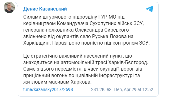 She wrote about this on her Facebook page after journalist and blogger Denys Kazanskyy was the first to spread information about the liberation of the Ruska Lozova village in Kharkiv region on April 29.
