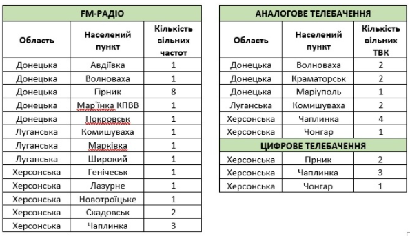 The National Council on Television and Radio Broadcasting invites broadcasters to develop free 23 FM frequencies and 18 television channels (12 for analogue and six for digital broadcasting) шn the territory of the Joint Forces (JFO) operation, as the National Council reported.