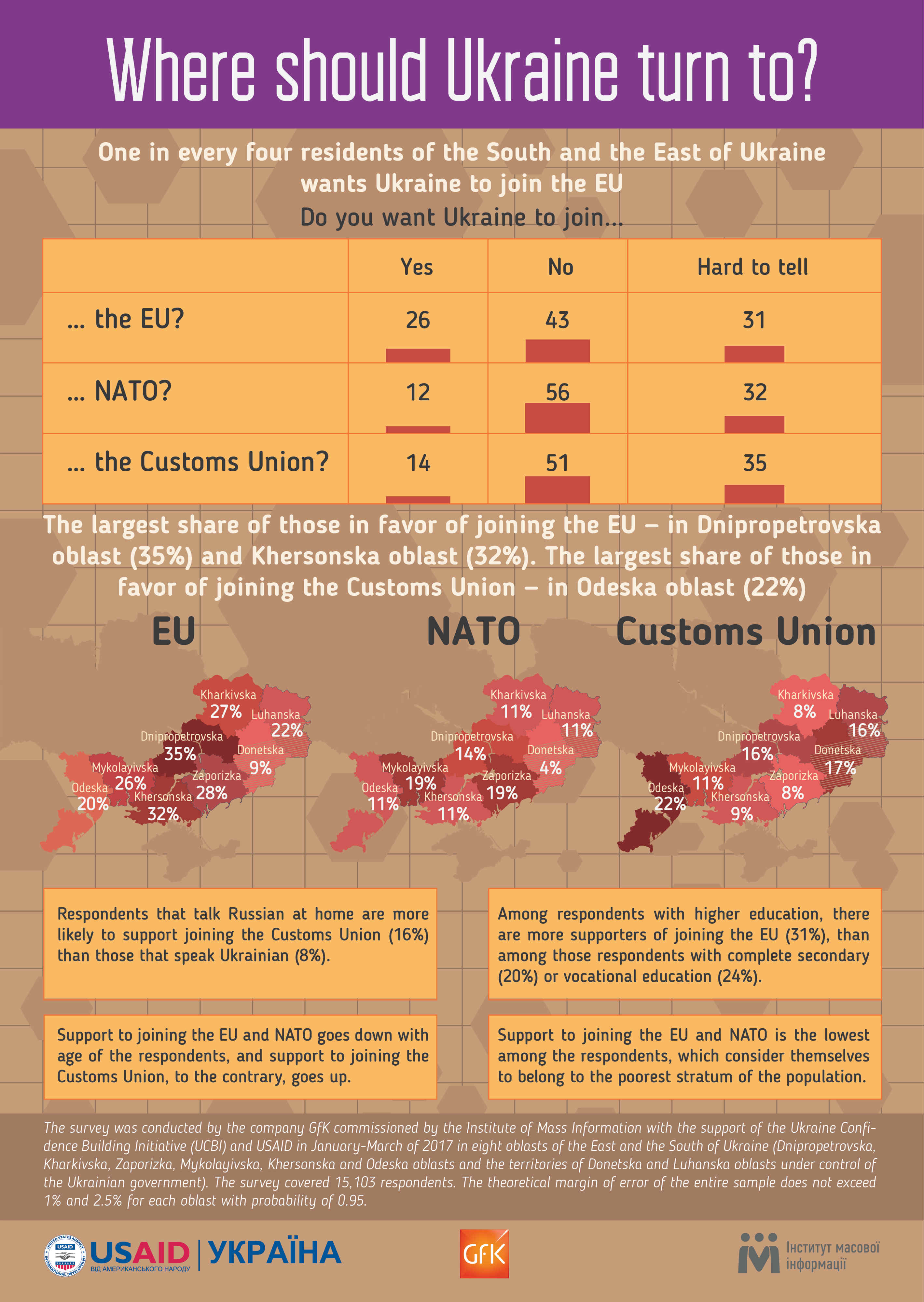 One in every four residents of the East and the South of Ukraine wants Ukraine to join the European Union, while joining NATO and the Customs Union enjoys significantly poorer support (13% and 14%, respectively). At the same time, around the third of the residents are still undecided on the issue.