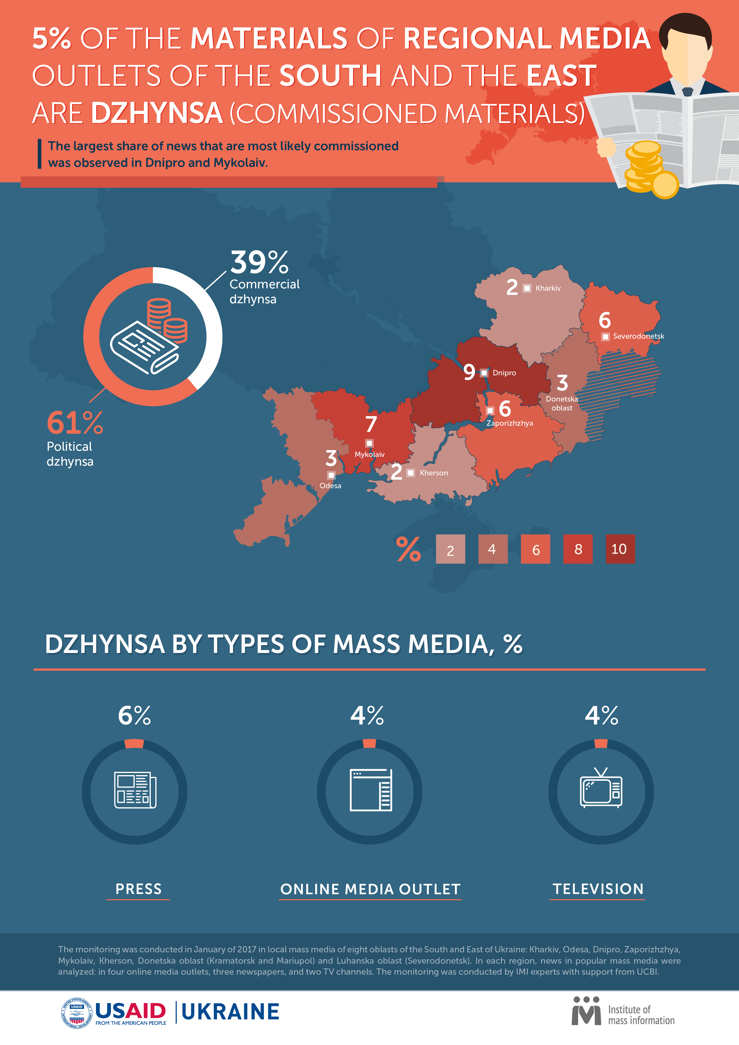 According to IMI expert Olena Holub, «the share of dzhynsa in the studied oblasts is rather high, which can be indicative of a certain political crisis, which leads to systemic appearance of political commissioned materials in local media outlets».