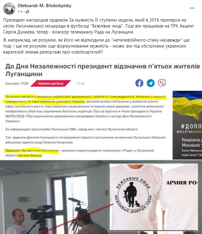 Oleksandr Bilokobylsky, journalist for "Realna Hazeta" and "Zmist," wrote: "I don't understand the word 'courage:' what if he was filming stories about 'liberators' under fire from 'Ukrainian punitive forces?'"