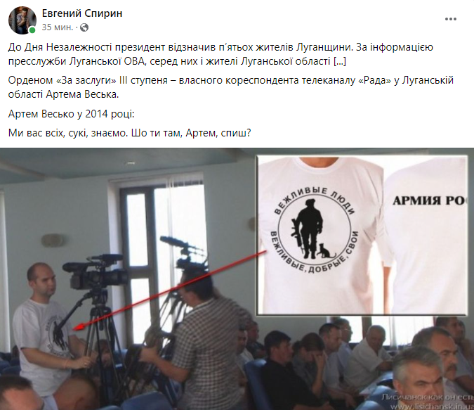 Luhansk journalists are outraged by the fact that Artem Vesko, Rada TV channel's correspondent in Luhansk oblast, has received a state award on the occasion of Independence Day.