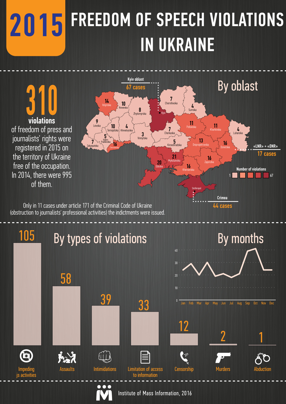 In 2015, in the territory of Ukraine not under occupation, there were 310 registered violations of the freedom of press (as of December 24), which is three times less than in 2014 (995 cases).