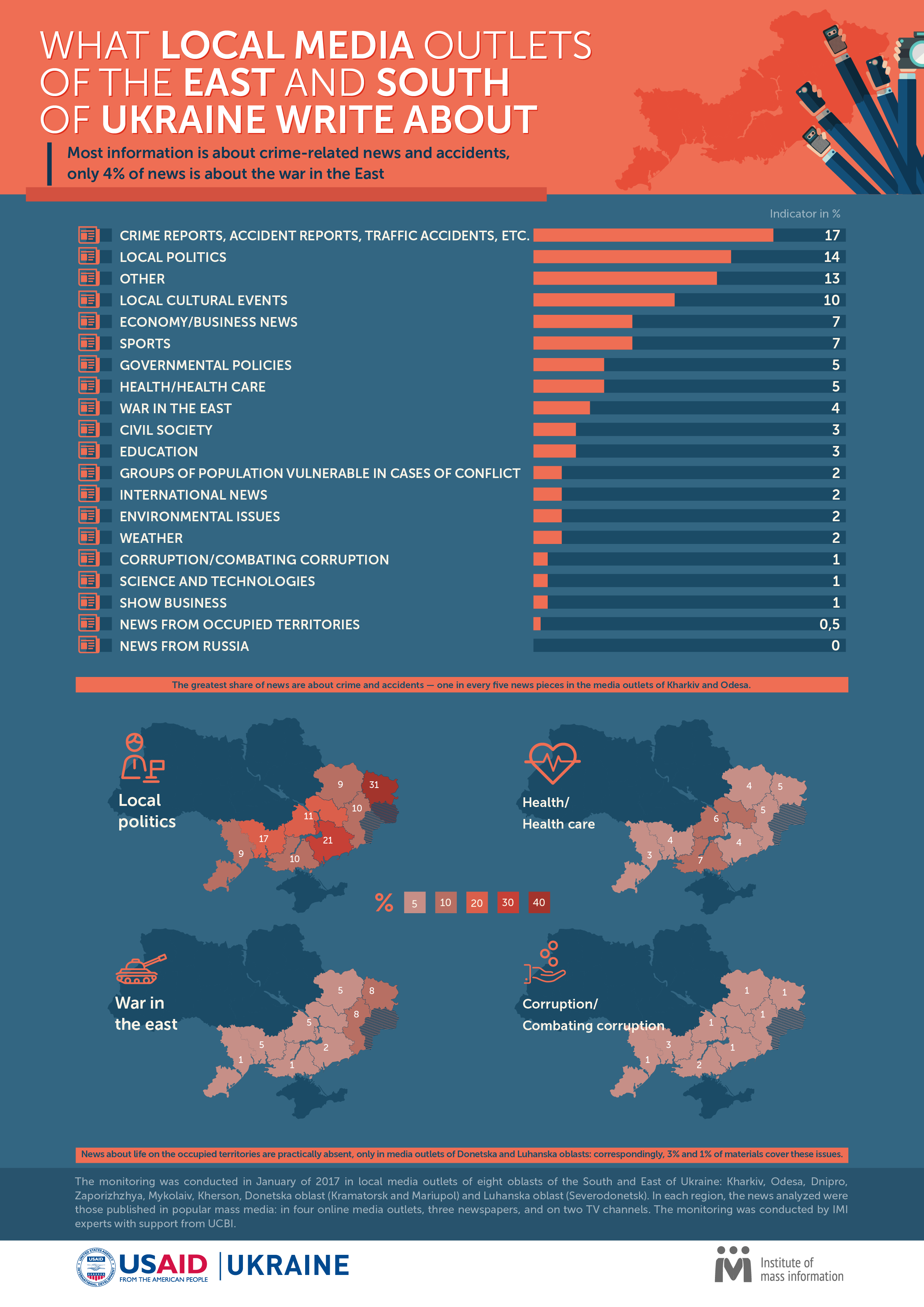 Monitoring was conducted by the experts of the Institute of Mass Information with the support from the Ukrainian Confidence Building Initiative (UCBI), which is funded by the United States Agency for International Development (USAID). The monitoring covered local media outlets of Kharkiv, Odesa, Dnipro, Zaporizhzhia, Mykolayiv, Kherson, Donetska oblast (Kramatorsk and Mariupol) and Luhanska oblast (Severodonetsk), during January-February of 2017. In every oblast, IMI experts analyzed news in three printed media outlets, four popular online media outlets and two TV channels. In total, the experts processed 2,612 materials of printed media outlets, 4,692 materials from online media outlets, and 650 TV materials.