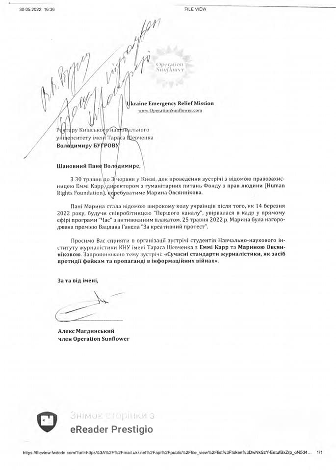 According to Hromadske Radio's sources, the rector of the Shevchenko National University of Kyiv had been asked to "facilitate the organization of a meeting of students from the Institute of Journalism of Kyiv National University with human rights activist Amy Karr and russian citizen Marina Ovsyannikova." The head of the Institute of Journalism, Volodymyr Rizun, refused the meeting. The man asking for "facilitation" was Alex Mahdynsky – an Operation Sunflower member.