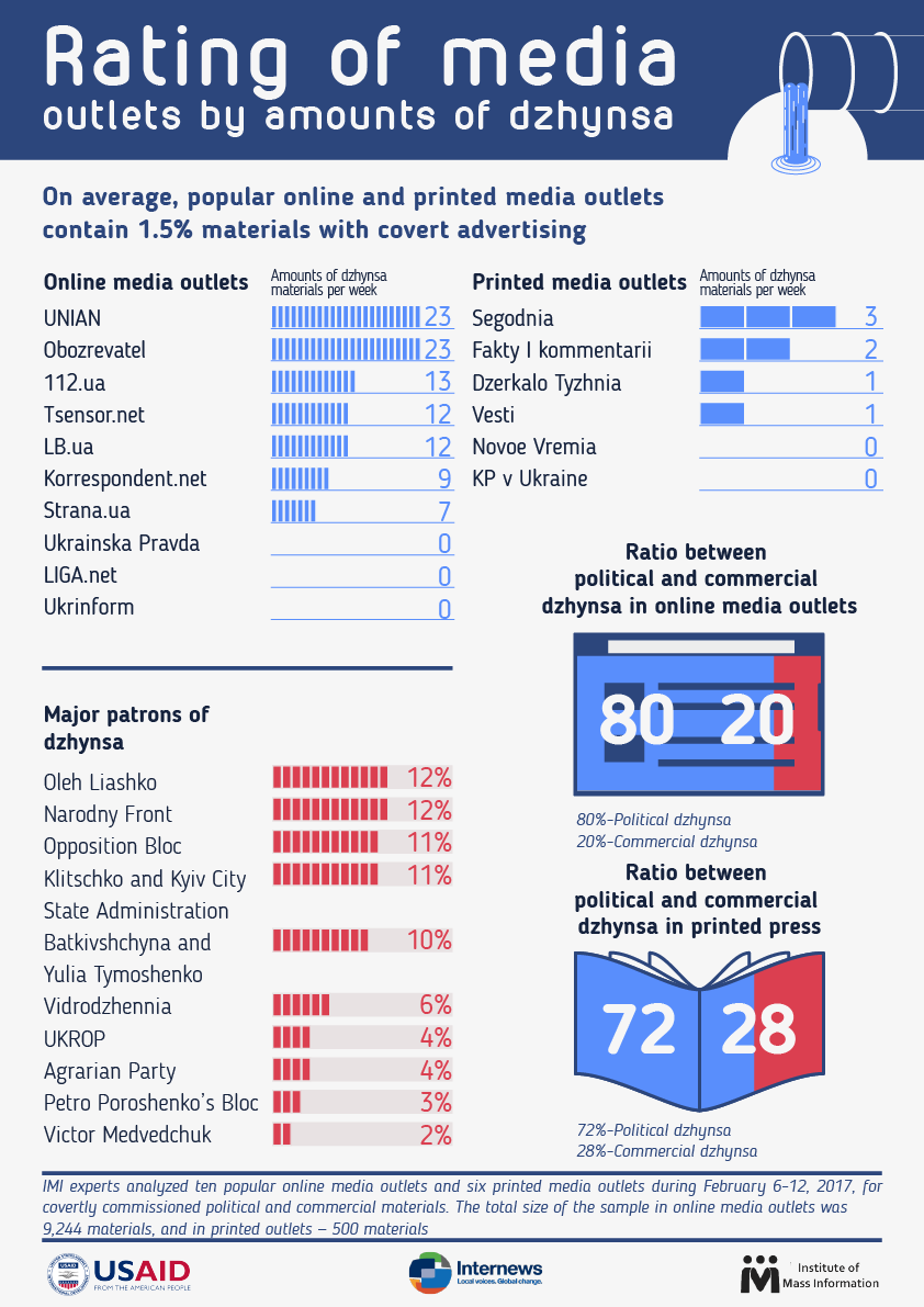 IMI experts conducted the monitoring with the support of U-Media Internews Network Inc. in February 2017. Experts analyzed ten popular national online media outlets ("Ukrainian Pravda LIGA.net, Ukrinform, 112.ua, UNIAN, LB.ua, Censor.net, Strana.ua "Obozrevatel", Korrespondent.net) and six national printed media outlets ( "Dzerkalo Tyzhnia", "Novoy vremya", "Fakty i kommentarii", "Segodnia", "KP v Ukraine", "Vesti").