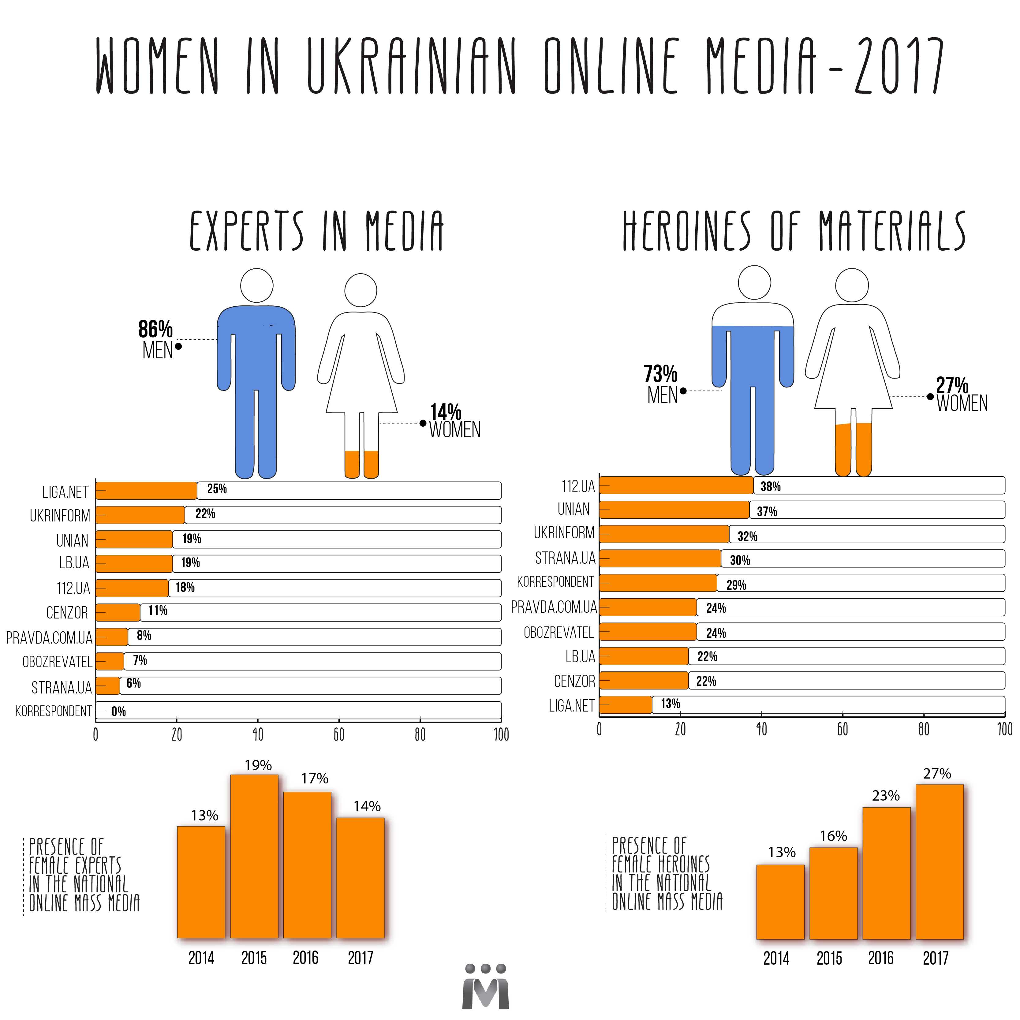 Based on IMI’s research, in the national mass media, women represented as experts in outlets - Liga (25% of the news), Ukrinform (22%), UNIAN and LB.ua (by 19%), the lowest - in the Ukrainska Pravda (8%), Obozrevatel (7 %), and Correspondent (0%).
