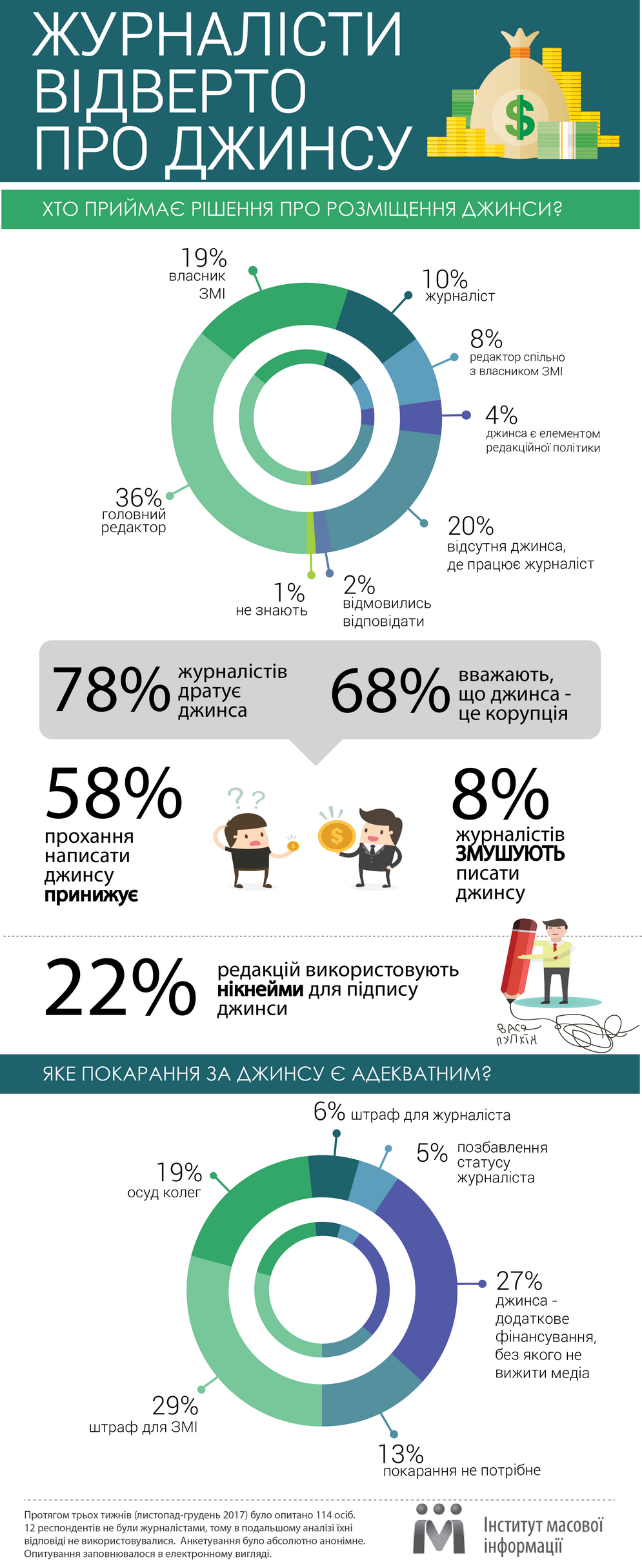 За даними ІМІ, виявилося, що 68% опитаних журналістів вважають джинсу синонімом корупції в медіа. Водночас 32% з цим твердженням не згодні. Прохання про написання джинси принижує 58% опитаних, тоді як 12% просто байдуже, а 30% таке прохання приниженням не вважають.