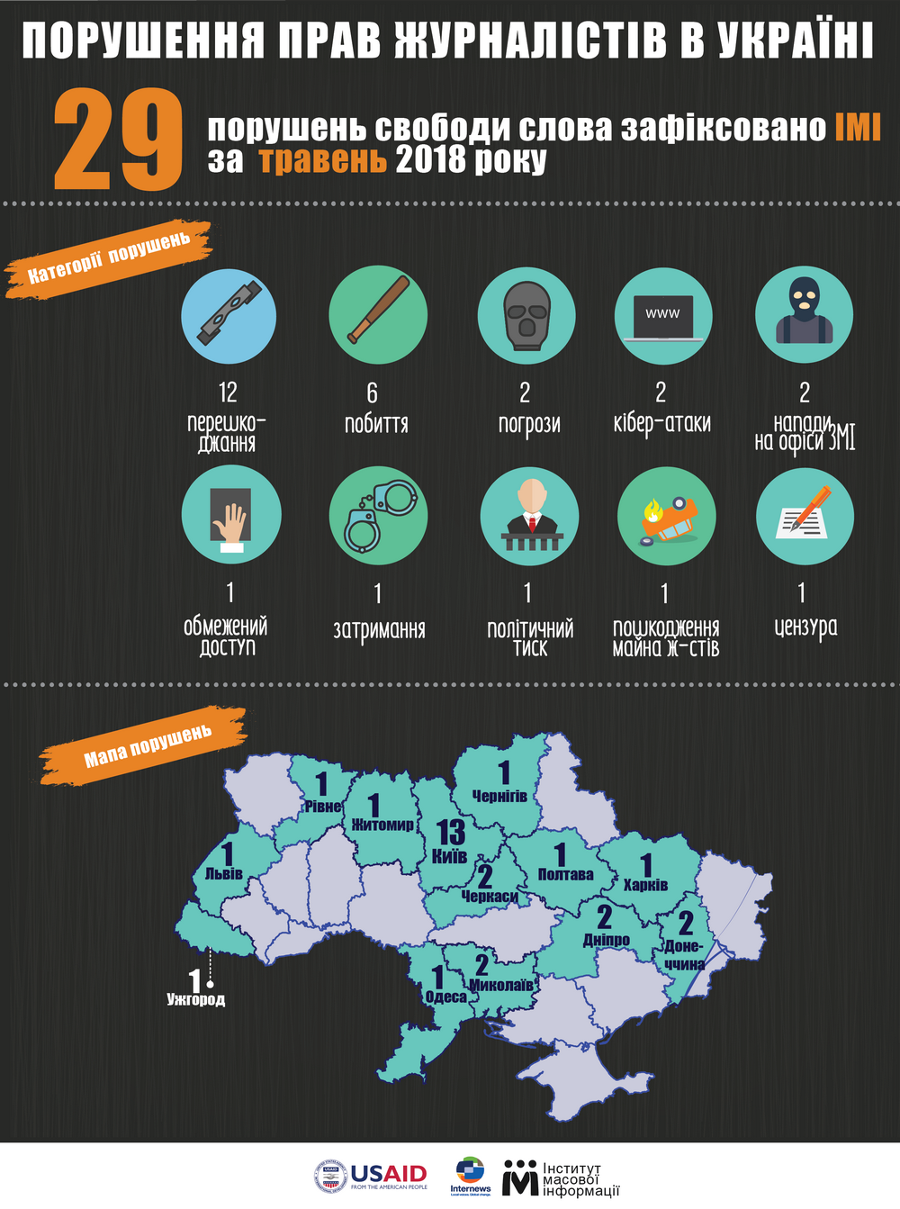 У травні експерти Інституту масової інформації зафіксували загалом 29 випадків порушень свободи слова (квітень – 17, березень – 24, лютий – 34, січень – 13). Найбільша кількість порушень зафіксована в категорії “перешкоджання законній журналістській діяльності” – 12. Ця кількість дещо зросла в порівнянні з квітнем, коли було зафіксовано 9 випадків (березень – 9, лютий – 18, січень – 5). Такі дані подає щомісячний моніторинг ІМІ “Барометр свободи слова”.