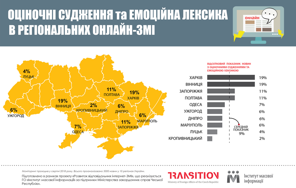 За даними дослідження ІМІ, в період моніторингу експертами було виявлено 459 порушень у 5 тисячах новин. У середньому 9% новин у регіональних онлайн-ЗМІ виходило з емоційною лексикою або оціночними судженнями авторів новин, які порушували нейтральний контекст новинних повідомлень.