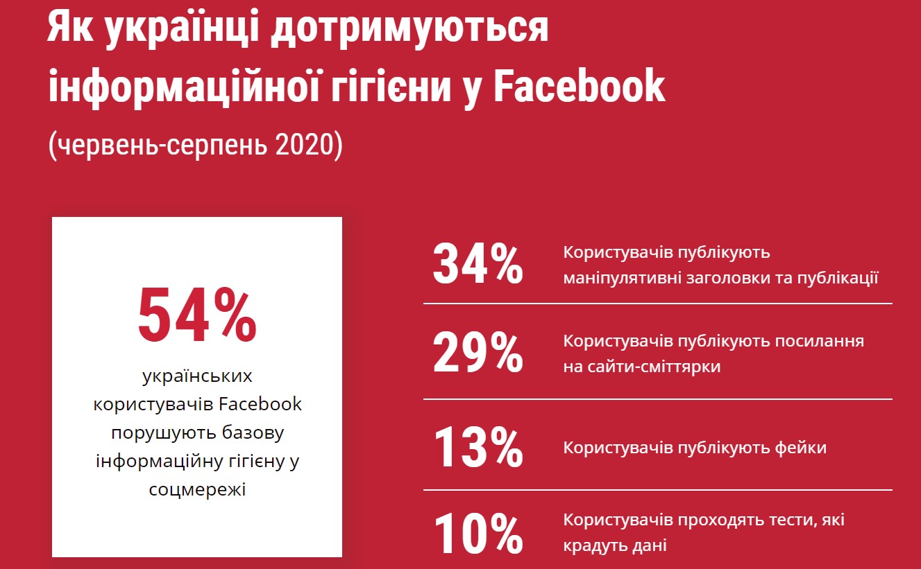 54% українських користувачів Facebook публікують фейки та маніпуляції. Такими є результати дослідження рівня інформаційної гігієни українців у Facebook, яке в серпні 2020 року провела ініціатива "Як не стати овочем", повідомляє MediaSapiens.