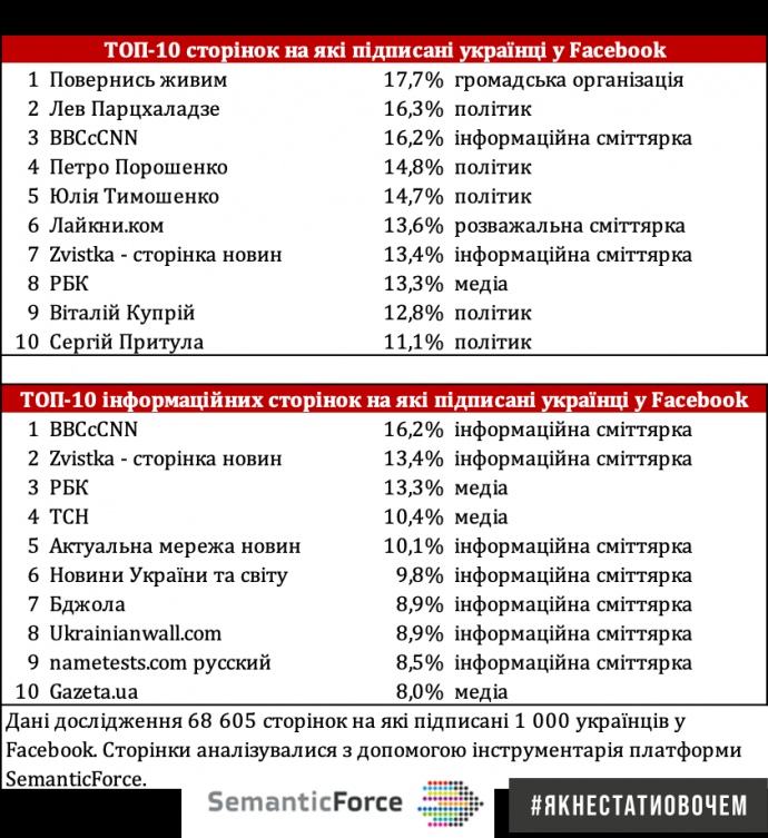 Водночас лідирують у списку головних джерел інформації для українців у Facebook сайти-сміттярки. Кожен українець у середньому підписаний на 69 публічних сторінок. Проаналізувавши 68 605, волонтерська ініціатива "Як не стати овочем" виділила десять найпопулярніших.