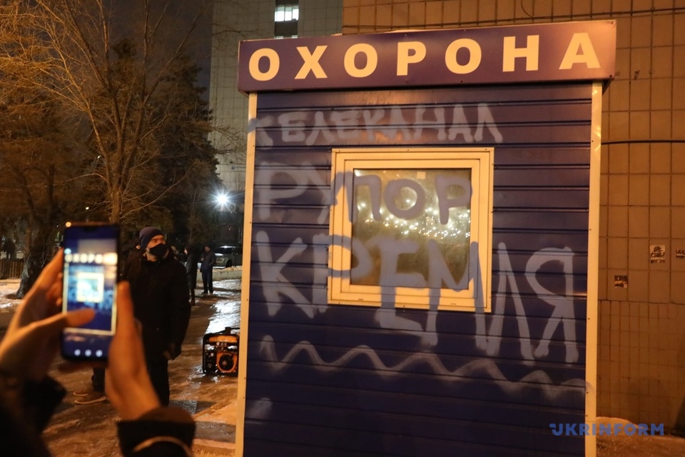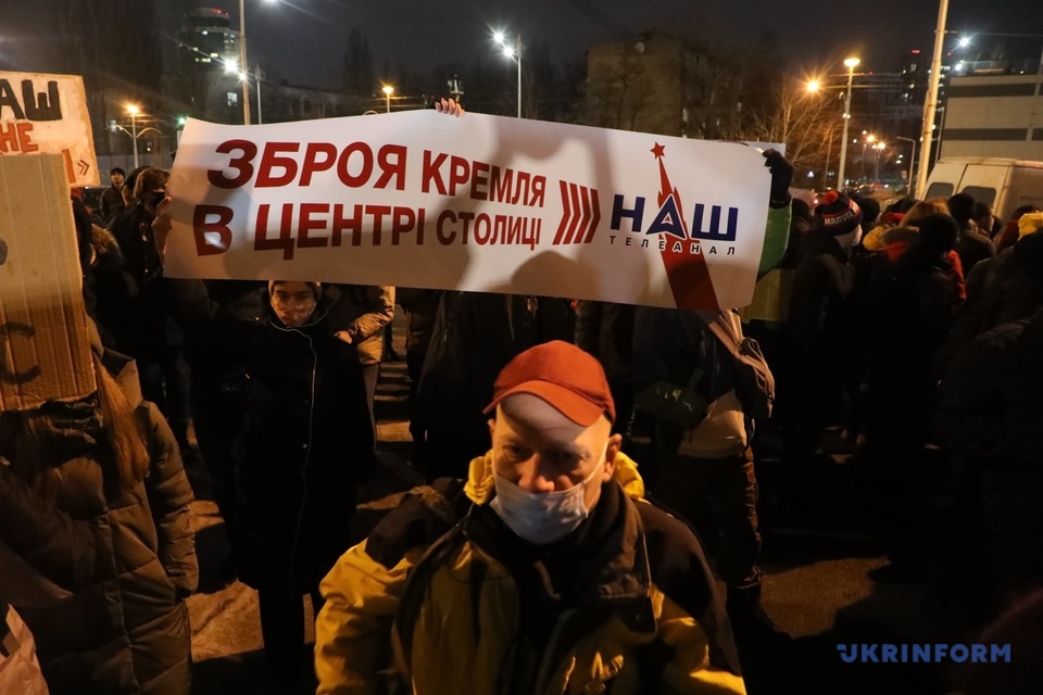 Як повідомляв ІМІ, 1 лютого в Києві під телеканалом “Наш” пройшла акція протесту активістів з вимогою його закриття та запровадження санкцій щодо власника Євгена Мураєва. Учасники звинуватили телеканал в антиукраїнській пропаганді в інтересах РФ. Вони наклеїли символіку армії РФ на банер телеканалу “Наш”, створили біля входу символічний блокпост, облили вхід до каналу червоною фарбою.