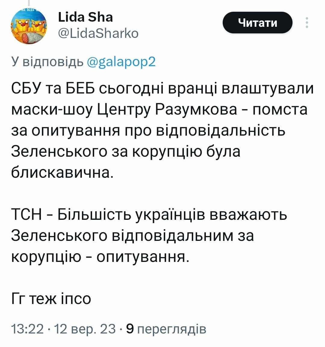 Низка анонімних акаунтів у соцмережах Facebook та X повідомила 12 вересня про нібито обшуки Служби безпеки України та Бюро економічної безпеки України в офісі соціологічної служби Центр Разумкова через опитування щодо відповідальності президента Володимира Зеленського за корупцію.