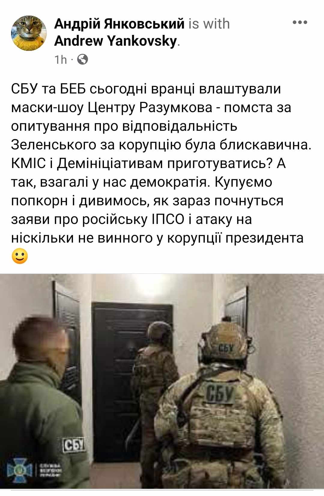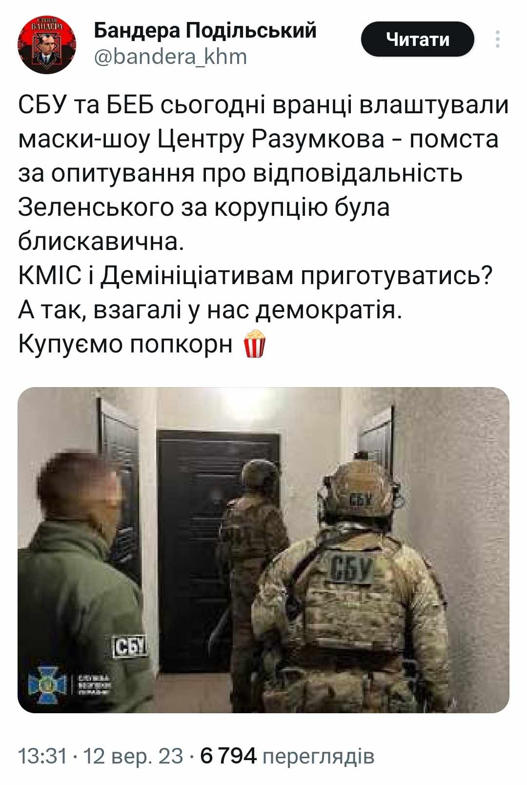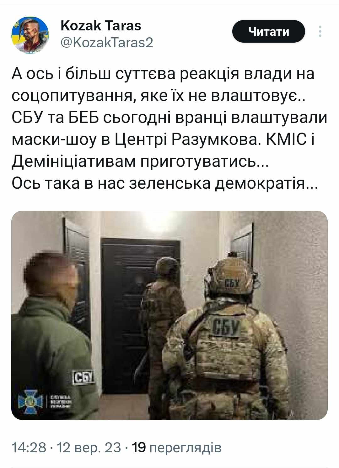 Анонімні акаунти поширили вкид про обшуки СБУ та БЕБ у Центрі Разумкова через опитування про корупцію (оновлено)