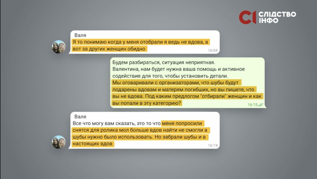 За декілька днів після публікації відео одна з жінок заявила в проросійському телеграм-каналі, що шуби після знімання забрали. Журналісти розшукали авторку повідомлень – Валентину – і в месенджері відрекомендувалися їй клієнтським відділом компанії "СобольЛакшері", яка, ймовірно, передала хутряні подарунки. Під час листування жінка неочікувано зізналася, що вона зовсім не вдова: її просто попросили знятись у відео.