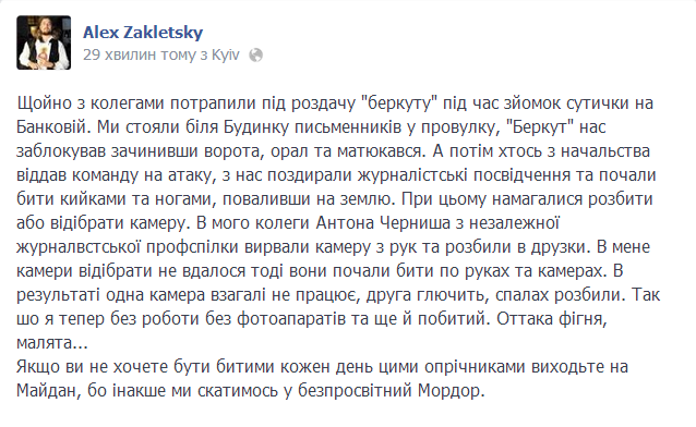 Ввечері 1 грудня на вулиці Банковій у Києві бійці спецпідрозділу "Беркут" напали на журналістів, при чому, зривали з них посвідчення, били кийками і ногами. Про це повідомив один із постраждалих, фотограф Олександр Заклецький, на своїй сторінці у Фейсбуці. За його словами, йому розбили спалах до фотоапарата і нанесли травми руки і ноги. У його колеги, Антона Черниша, журналіста із незалежної медіапрофспілки, бійці "Беркута" вирвали камеру з рук та розбили в друзки.