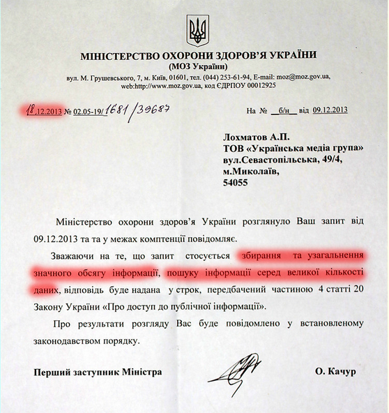 Як пише журналіст, цей запит в міністерстві проігнорували, тому 9 грудня він відправив повторний. «Ha цей раз прийшла відповідь, підписана першим заступником Богатирьової Олександром Качурой, в якій він заявив, що "цей запит вимагає збору та узагальнення великого обсягу інформації, пошуку інформації серед значної кількості даних" і повідомив, що відповідь на поставлені питання буде наданий у термін не 5 днів, a 20-ти, що передбачено ч.4 статті 20 3акону України "Про доступ до публічної інформаці"».