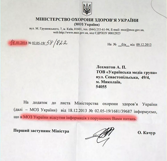 21 січня 2014 року до редакції поштою прийшла друга відповідь від Олександра Качури, підписана 14 січня, в якій він заявив, що «в Міністерстві охорони здоров'я відсутня інформація щодо поставлених питань». «Тобто, якщо станом на 18 грудня інформації прo поїздку Богатирьової в Миколаїв був "значний обсяг і велика кількість", то через 27 днів ця інформація зникла.