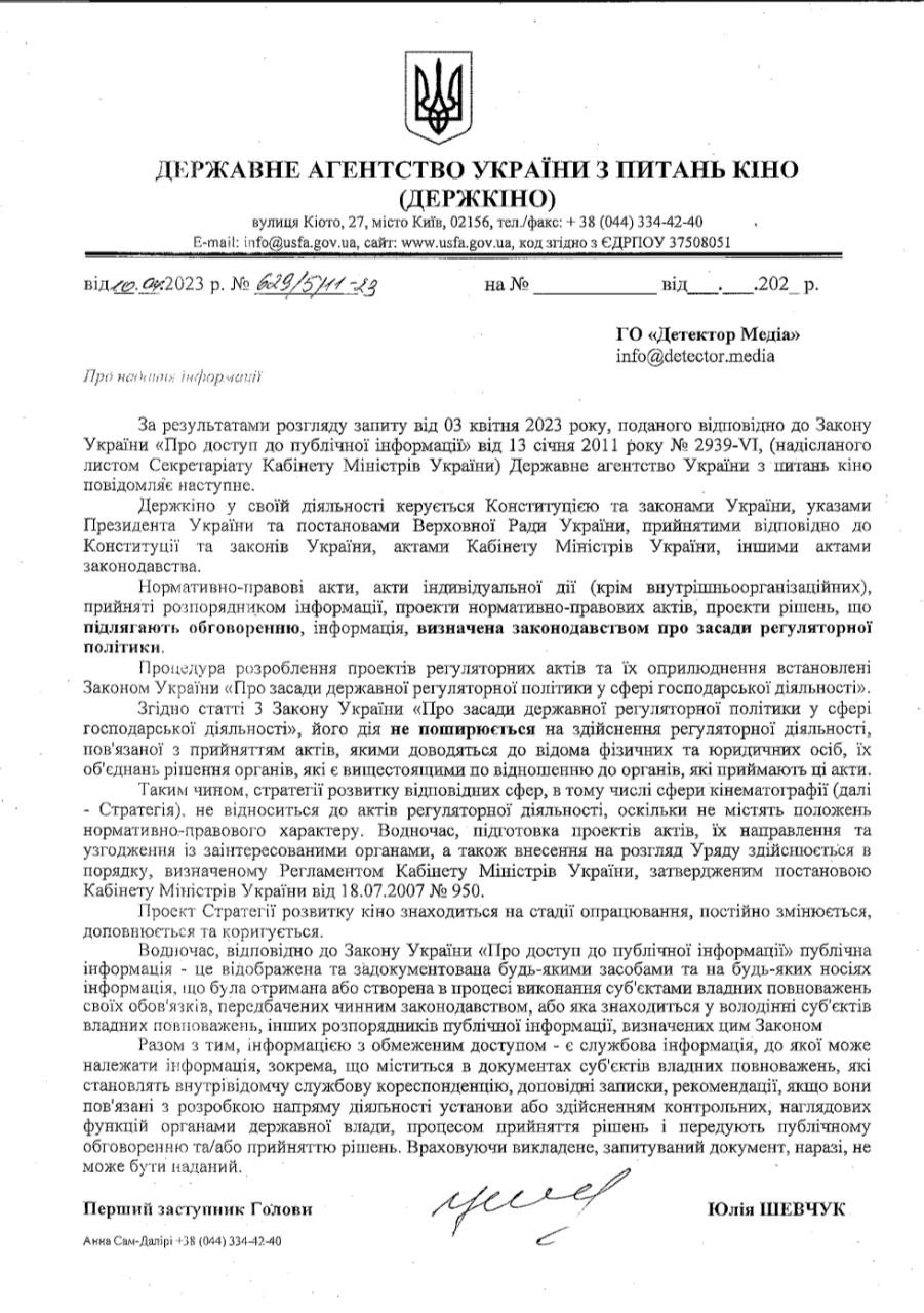 У відповіді Держкіно зазначило, що “проєкт Стратегії розвитку кіно знаходиться на стадії опрацювання, постійно змінюється, доповнюється та коригується”. Однак сам документ наразі не може бути наданий, адже є “інформацією з обмеженим доступом”.