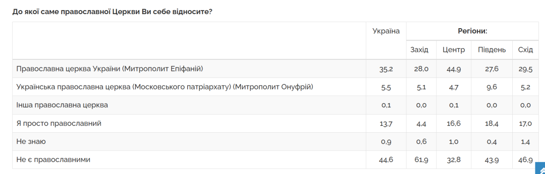 За даними дослідження, найбільша частка вірних ПЦУ в Центральному регіоні – 45%, на півдні та заході – 28%, на сході – 29,5%.