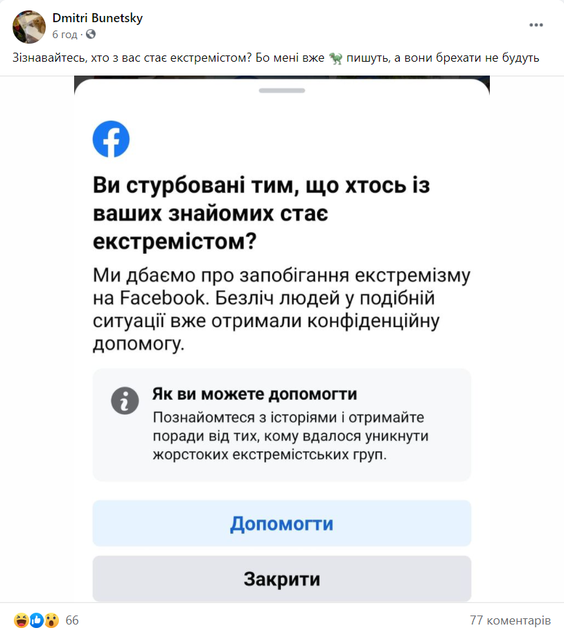 1 липня деякі користувачі соцмережі почали бачити сповіщення, у яких Facebook зауважує, що користувач зазнав впливу екстремістського контенту. Також соцмережа пропонувала допомогу в разі, якщо друзі користувачів "стають екстремістами".