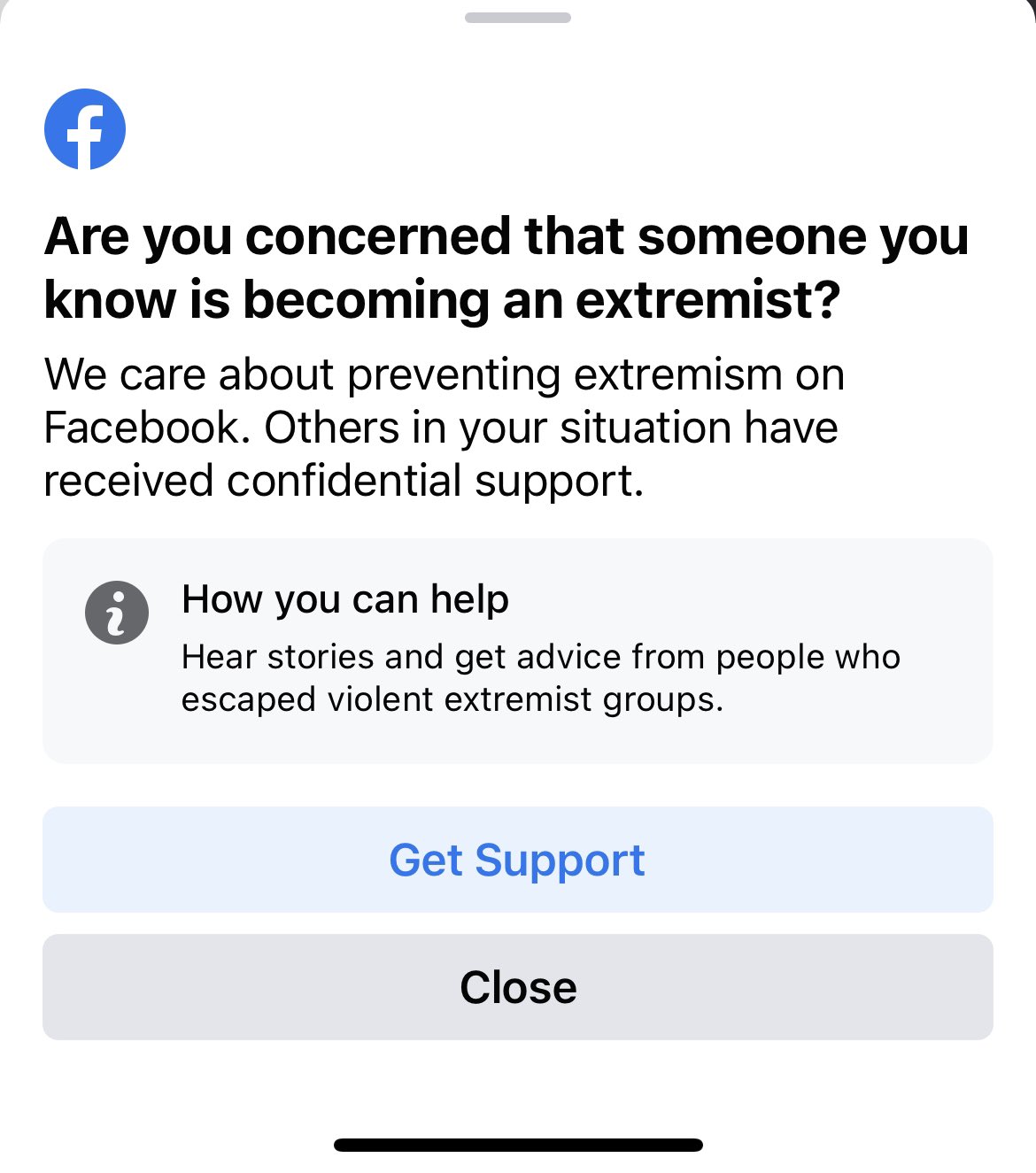 Facebook тестує нові попередження для людей, на яких міг вплинути "екстремістський контент" або чиї друзі можуть "ставати екстремістами".