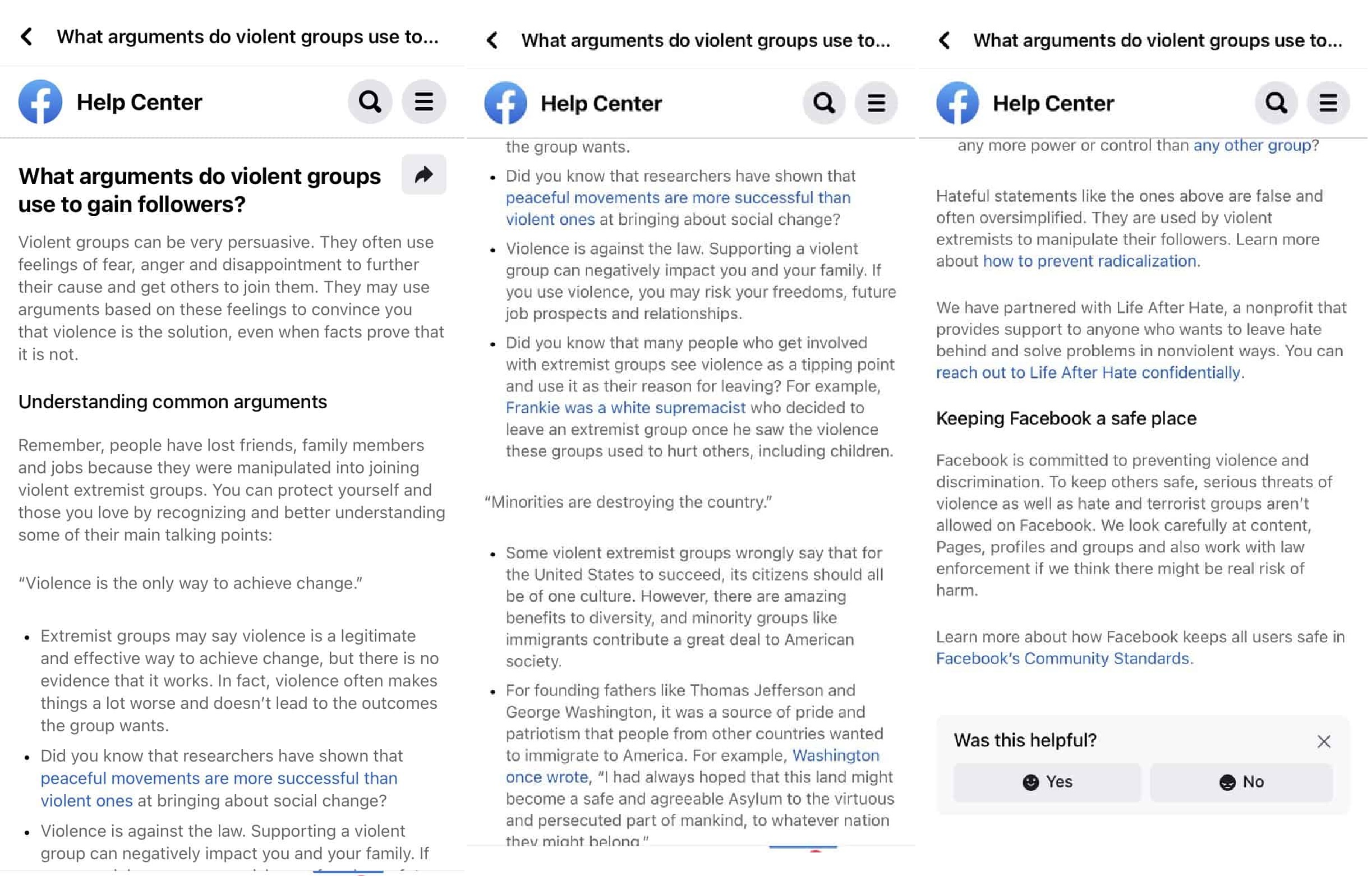 Якщо натиснути на "Допомогти", відкривається стаття з назвою "Які аргументи використовують насильницькі групи для залучення підписників?". Цю статтю наразі можна знайти через пошуковик, однак її текст недоступний. "Зараз ця функція доступна не всім", – йдеться в сповіщенні.