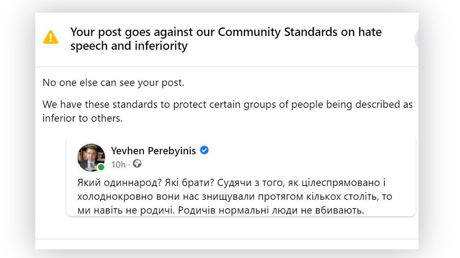 “Видалили мій пост. Цікаво, яке слово з нього суперечить правилам і розпалює ненависть? Адже я нікого не назвав прямо. Але "вони" розуміють, що “вони” – це “вони”)” – зазначив Перебийніс.