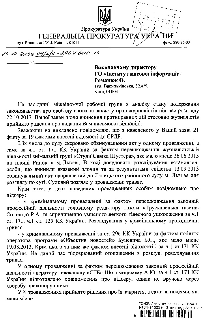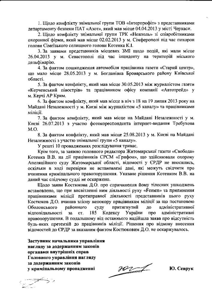 Зокрема, у відповіді ГПУ йдеться, що із названих 21 резонансної справи – 19 внесено до Єдиного реєстру досудових розслідувань. Не внесено справ за заявами головного редактора газети «Свобода» (м. Житомир) В. В. Котенка (на працівників спецпідрозділу «Грифон»), оскільки «в ході перевірки не встановлені дані, які можуть свідчити про вчинення кримінального правопорушення»; та Костюкова Д. О. (російський фотограф, побитий при висвітленні діяльності руху Femen), оскільки «Костюков Д. О. вчинив злісну непокору працівникам органів міліції» і був притягнутий до адміністративної відповідальності. Обидва заявники невнесення їх справ до ЄРДР не оскаржували.