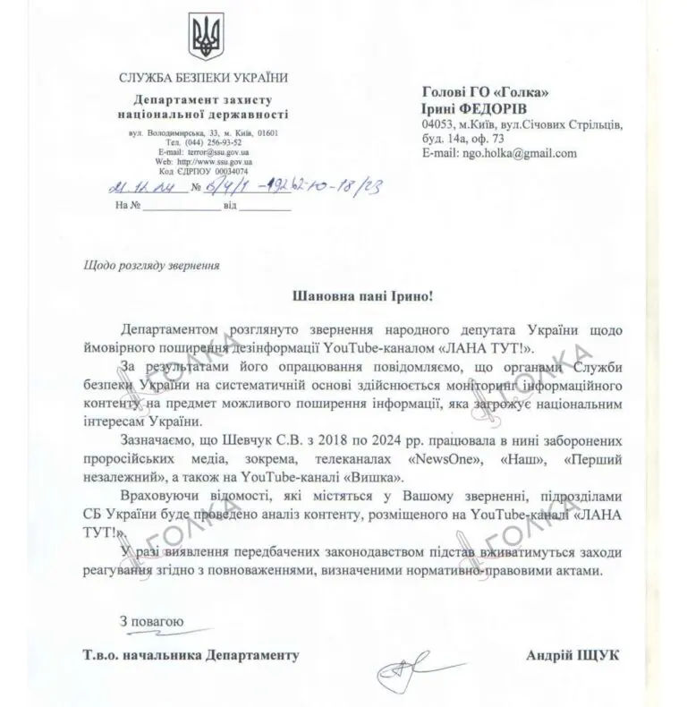 “Зазначаємо, що Шевчук С. В. з 2018 по 2024 рік працювала на нині заборонених проросійських медіа, зокрема телеканалах NewsOne, “Наш”, “Перший незалежний”, а також на YouTube-каналі “Вишка”. Враховуючи відомості, які містяться у вашому зверненні, підрозділами СБ України буде проведено аналіз контенту, розміщеного на YouTube-каналі “Лана ТУТ!”, – йдеться в офіційній відповіді СБУ.
