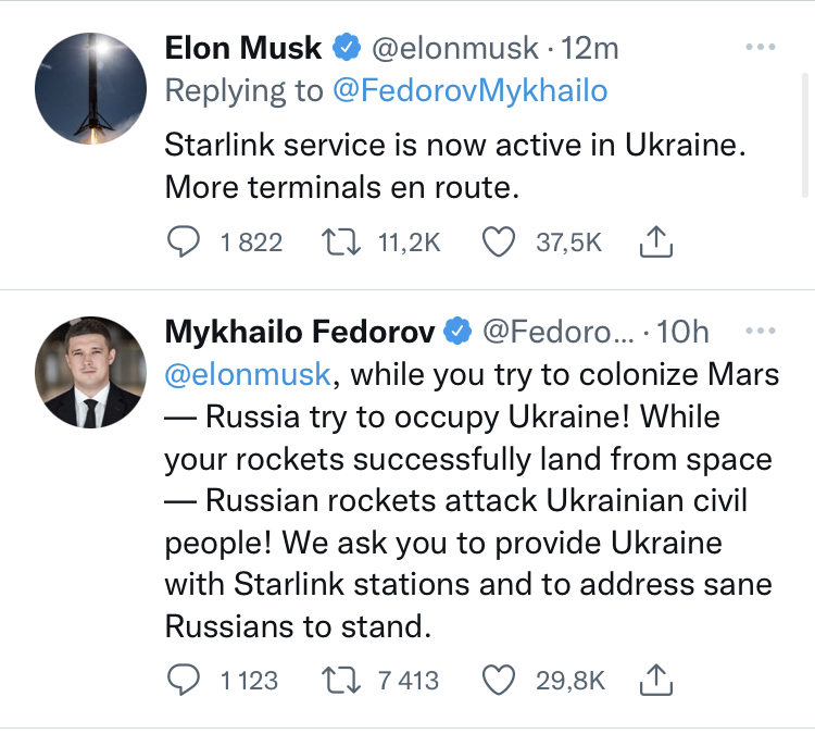 Голова Мінцифри Михайло Федоров в твітері звернувся до Ілона Маска з проханням надати забезппечити Україну супутниковим інтернетом Starlink. За кілька годин Маск в твітері відповів "Сервіс Starlink вже активовано в Україні. Більше терміналів в дорозі".