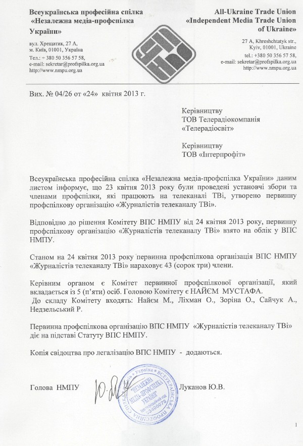 24 квітня журналісти телеканалу ТВі створили осередок Незалежної медіа-профспілки й офіційно повідомили про це керівництво каналу. До осередку увійшло 43 особи, він і далі поповнюється. Про це в ефірі «Сьогодні про головне» на ТВі о 19:30 повідомив ведучий Мустафа Найєм.