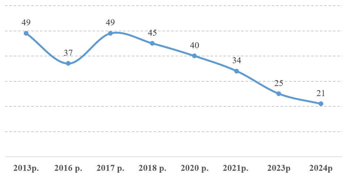 В Україні погіршилося ставлення до Міжнародного жіночого дня, 8 березня: його популярність останніми роками постійно зменшується. У 2017 році це свято було одним з найулюбленіших і його відзначала як улюблене приблизно половина населення (49%), у 2024 році – лише кожний п’ятий (21%).