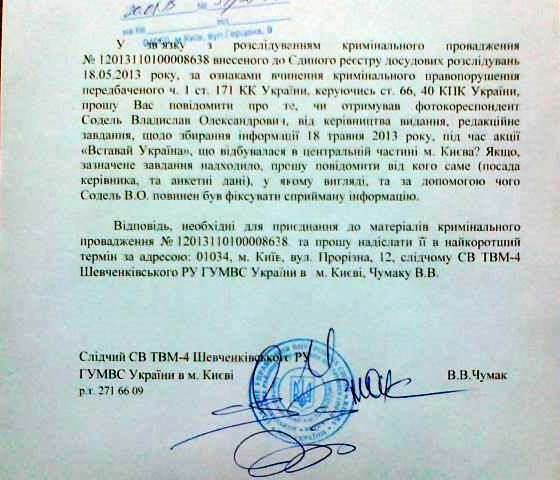 Слідчий Шевченківського райуправління міліції просить редакцію газети «Коммерсантъ-Украина» повідомити, чи отримував фотокореспондент Владислав Содель редакційне завдання на висвітлення акції «Вставай, Україно» 18 травня. Відповідний запит міліції оприлюднив на своїй сторінці у Facebook головний редактор «Коммерсанта» Валерій Калниш.