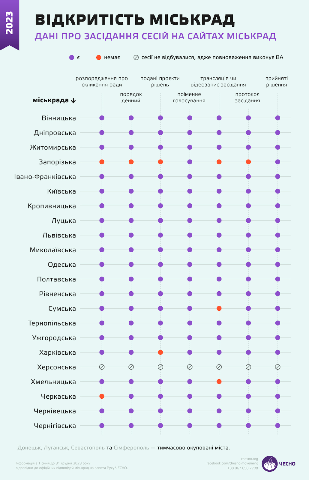 Рух ЧЕСНО втретє дослідив відкритість місцевих рад в Україні за 2023 рік. Критеріями оцінювання стали 11 маркерних питань, серед яких наявність анонсів про проведення сесій та засідань комітетів, публікація порядків денних, проєктів рішень, протоколів та відеозаписів засідань.