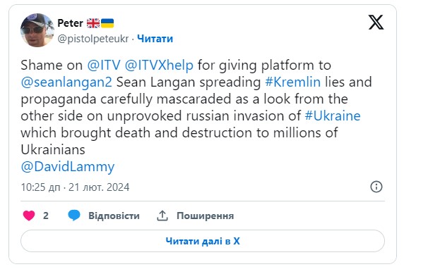 На недоречність виходу цього документального фільму на британському телебаченні звернули увагу і британські користувачі мережі X. Вони зауважують, що "журналіст Шон Ланган поширює кремлівську брехню та пропаганду, ретельно замасковану під погляд з іншого боку на неспровоковане російське вторгнення в Україну, яке принесло смерть і руйнування мільйонам українців".